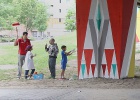 Los vecinos pintan un mural bajo un paso elevado que da acceso a este barrio del distrito de Villaverde y recuperan un espacio abandonado